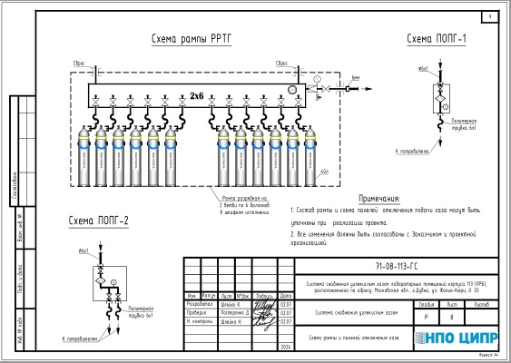 Разработана рабочая документация системы снабжения углекислым газом института ядерных исследований в г.Дубне. В качестве источника газов предусмотрена разрядная рампа шкафного исполнения на 12 баллонов. Документация выполнена в соответствии с требованиями в области промышленной безопасности. Размещение разрядной рампы выполнено в соответствии с требованиями Правил промышленной безопасности при использовании оборудования, работающего под избыточным давлением», утв. Приказом Ростехнадзора от 15.12.2020 №536.